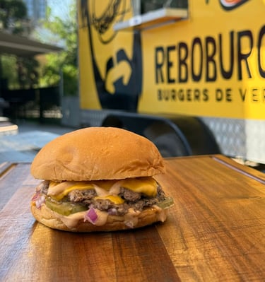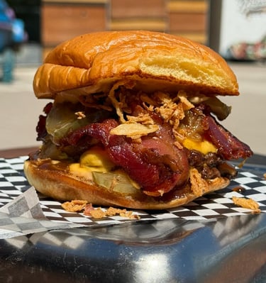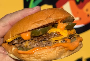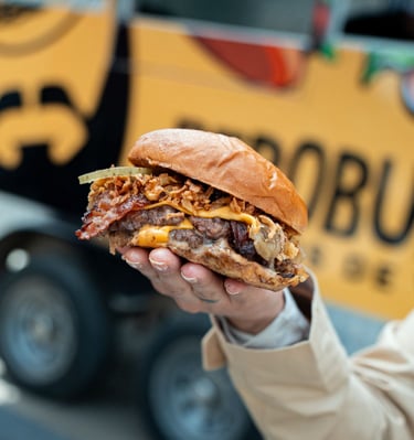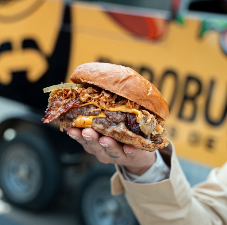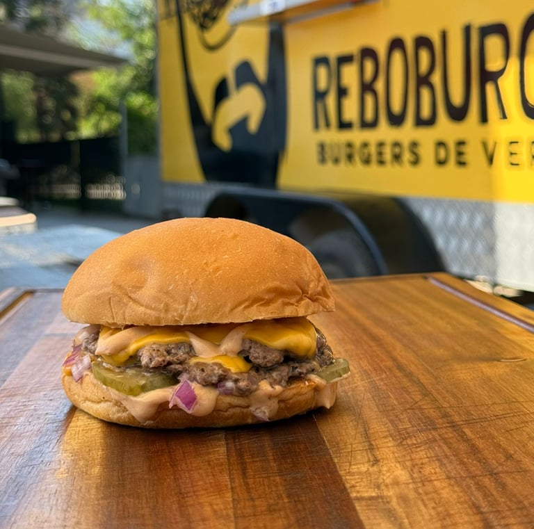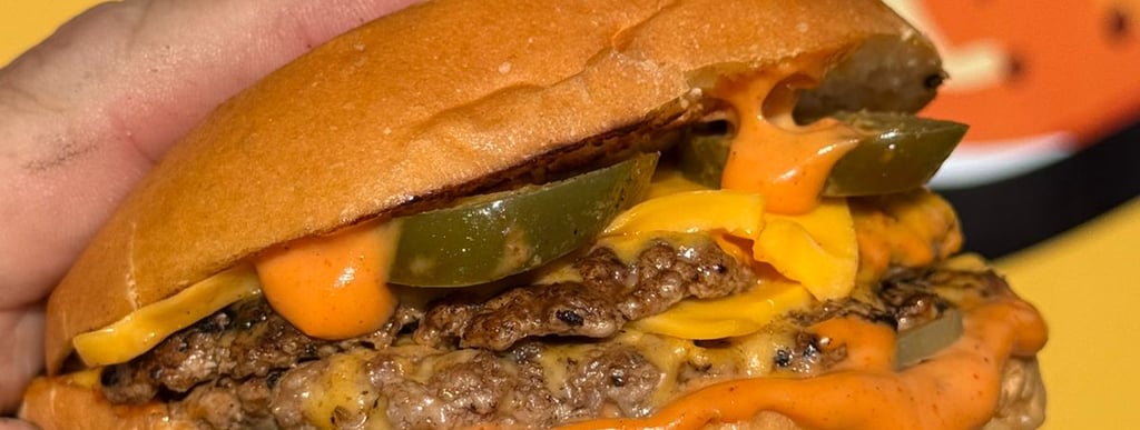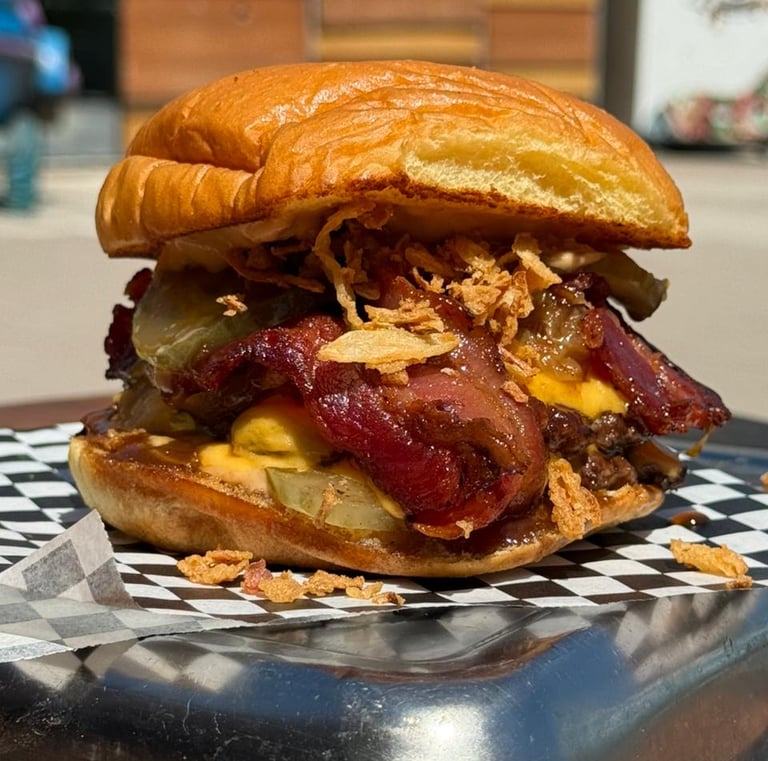 Brioche de papa, doble carne, doble queso, salsa Chomi (picante), cebolla, pepinillos, tocino