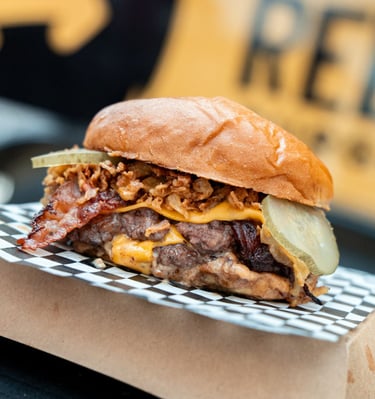 Brioche de papa, TRIPLE carne, TRIPLE queso, salsa Agus, cebolla, pepinillos, tocino, cebolla caramelizada, cebolla crispy
